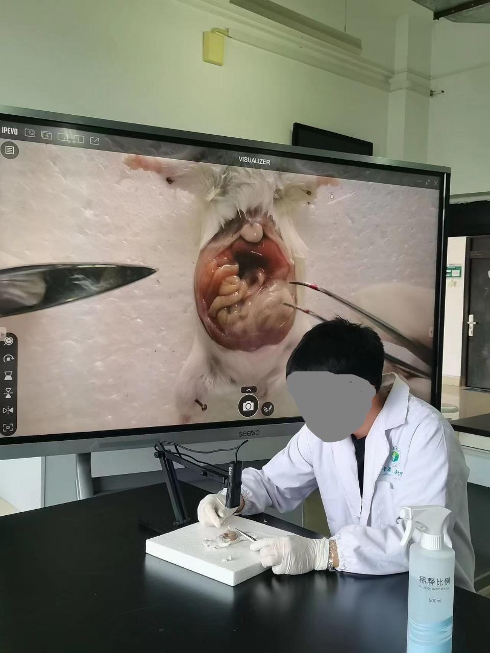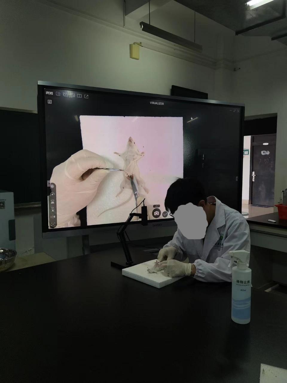 图2 课中老师对小白鼠进行解剖 爱比沃IPEVO P2V Ultra超微距教学摄像头的引入,犹如一道曙光,照亮了解剖教学的困境。这一先进的设备能够将小白鼠解剖的过程进行超微距拍摄,并通过连接投影仪或电子显示屏,将清晰的图像实时展示在教室的各个角落。即使是坐在教室最后一排的学生,也能如同近距离观看一般,清晰地看到解剖刀如何精准地划开小白鼠的皮肤,暴露出下面粉嫩的肌肉组织,以及如何小心地分离肌肉,显露出内部错综复杂的器官。