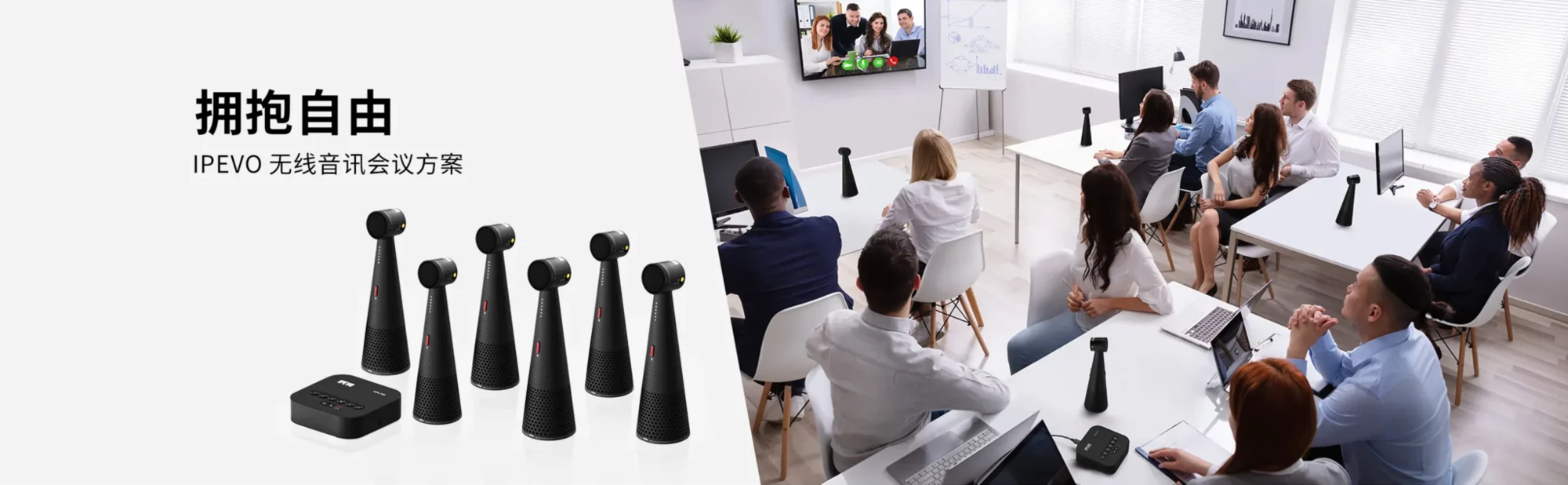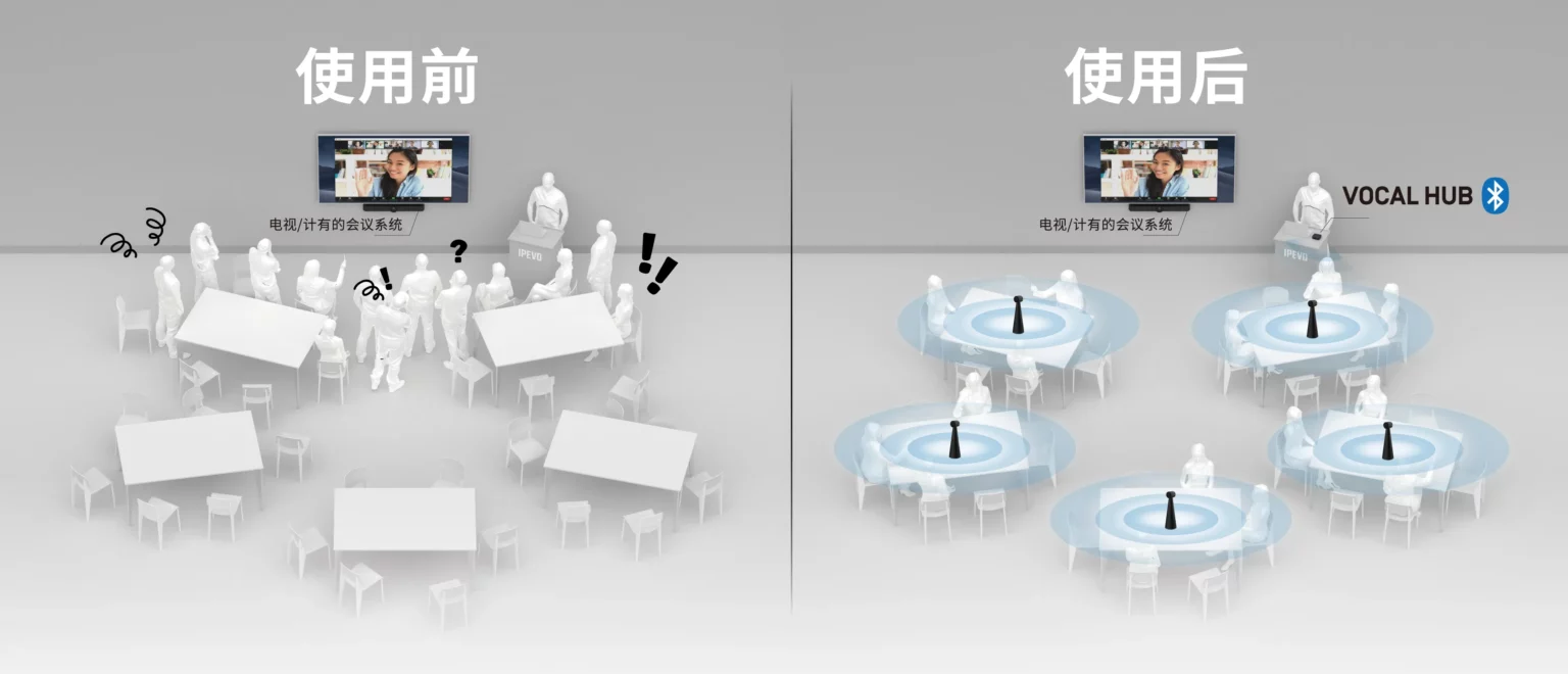 IPEVO VOCAL HUB 无线音讯会议方案 ,优化混合会议的无线音讯体验;其灵活的移动特性,确保每个人都处于良好的声音接收范围,每位与会者的声音都能清晰传递和接收。